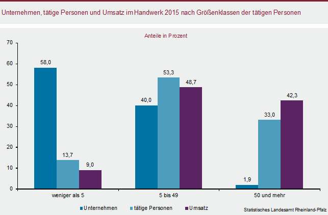Das Handwerk ist durch kleine und mittlere Unternehmen geprägt. In 58 Prozent der Unternehmen waren weniger als fünf Personen tätig. Diese Unternehmen vereinten 14 Prozent des Handwerkspersonals und neun Prozent der gesamten Umsätze des Handwerks auf sich. Zur Größenklasse mit fünf bis 49 tätigen Personen zählten 40 Prozent der Unternehmen. Auf sie entfielen 53 Prozent der tätigen Personen und 49 Prozent des Umsatzes. Nur 1,9 Prozent der Unternehmen gehörten der Größenklasse mit 50 und mehr tätigen Personen an. Diese Unternehmen beschäftigten jedoch ein Drittel der Arbeitskräfte und erwirtschafteten 42 Prozent der Handwerksumsätze.