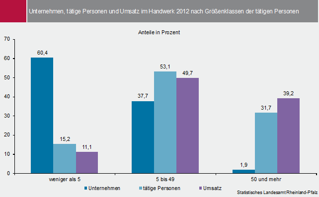 In 60,4 Prozent der Unternehmen waren weniger als fünf Personen tätig; sie vereinten 15,2 Prozent des Handwerkspersonals und 11,1 Prozent des Umsatzes auf sich. Fünf bis 49 Personen waren in 37,7 Prozent der Unternehmen tätig, sie stellten einen Anteil von 53,1 Prozent an allen Beschäftigten und generierten 49,7 Prozent des Umsatzes. Auf die 1,9 Prozent der Unternehmen mit 50 und mehr tätigen Personen entfielen 31,7 Prozent der Arbeitskräfte und 39,2 Prozent des Umsatzes im Handwerk.