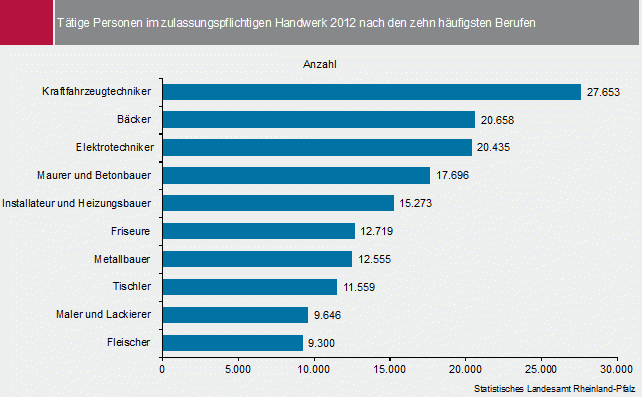 Im Ranking der Handwerksberufe standen Kraftfahrzeugtechniker mit 27.653 Personen auf Platz eins, gefolgt von Bäckern (20.658) und Elektrotechnikern (20.435).