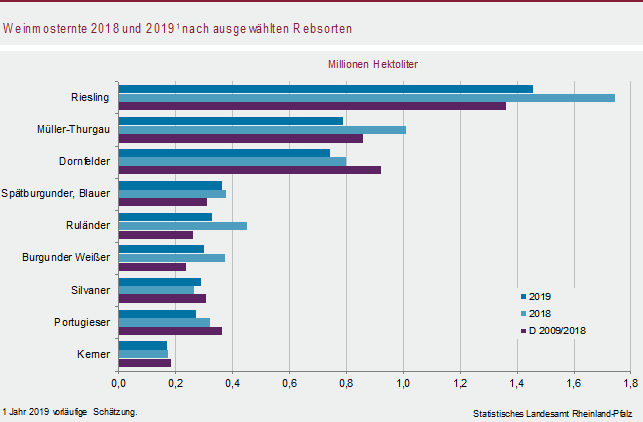 Knapp ein Viertel der Erntemenge (1,5 Millionen Hektoliter) entfällt auf Riesling, der mit Abstand wichtigsten Rebsorte im Land. Die Erntemenge liegt knapp 17 Prozent unter der von 2018. Mit rund 0,8 Millionen Hektoliter folgen Müller-Thurgau und Dornfelder mit 0,7 Millionen Hektoliter.