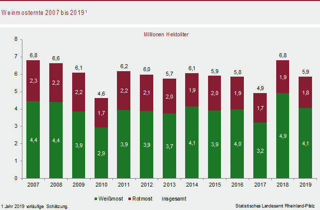 Die Erntemenge der weißen Moste liegt nach den aktuellen Schätzungen mit 4,1 Millionen Hektoliter knapp sechs Prozent über dem Durchschnitt der Jahre 2009 bis 2018. Beim Rotmost liegt die Erntemenge mit 1,8 Millionen Hektoliter um 8,5 Prozent unter dem Niveau des langjährigen Mittels von knapp zwei Millionen Hektolitern. Zum Vorjahr beträgt der Rückgang der Erntemenge sechs Prozent.