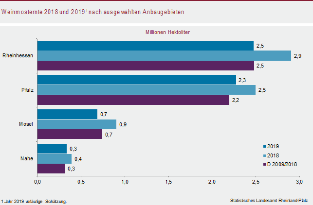 Für Rheinhessen – dem größten Weinanbaugebiet Deutschlands – wurde mit 2,5 Millionen Hektoliter eine Erntemenge geschätzt, die dem langjährigen Vergleichswert entspricht. In der Pfalz wird die Erntemenge mit 2,3 Millionen Hektoliter marginal über dem Durchschnitt liegen. An der Mosel wird eine Erntemenge von 0,7 Millionen Hektoliter erwartet, das wären fast acht Prozent weniger als im langjährigen Durchschnitt und rund ein Viertel weniger als im Vorjahr.