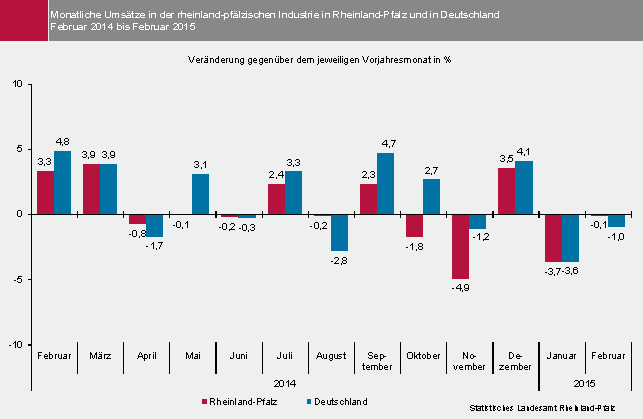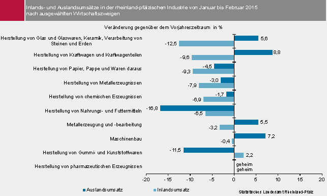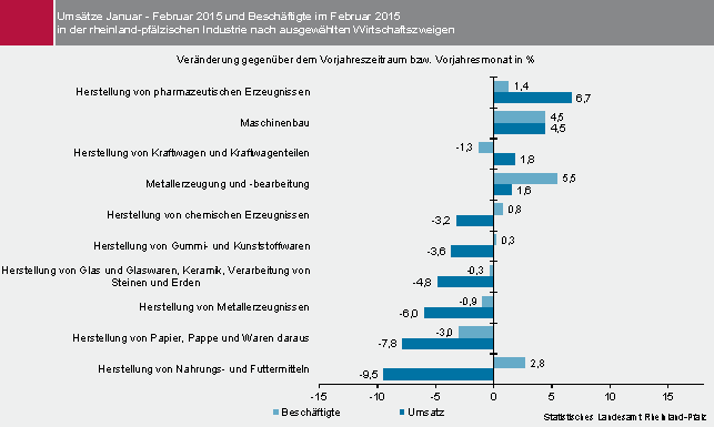 Sechs der zehn umsatzstärksten Industriebranchen erzielten von Januar bis Februar 2015 im Vergleich zum Vorjahreszeitraum Umsatzrückgänge. In der chemischen Industrie sank der Gesamtumsatz um 3,2 Prozent, was sich sowohl aus rückläufigen Geschäften mit inländischen als auch mit ausländischen Kunden erklärt. Die Hersteller von Nahrungs- und Futtermitteln (minus 9,5 Prozent) sowie die Hersteller von Papier, Pappe und Waren daraus (minus 7,8 Prozent) meldeten die stärksten Umsatzrückgänge. Diese Entwicklung resultierte aus Rückgängen im Inlands- und Auslandsgeschäft. Die pharmazeutische Industrie (plus 6,7 Prozent) und der Maschinenbau (plus 4,5 Prozent) erzielten die höchsten Umsatzzuwächse. In der Herstellung von Kraftwagen und Kraftwagenteilen, der Branche mit dem zweithöchsten Umsatz, stiegen die Erlöse insgesamt um 1,8 Prozent, was alleine dem guten Auslandsgeschäft zu verdanken ist.