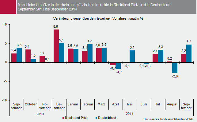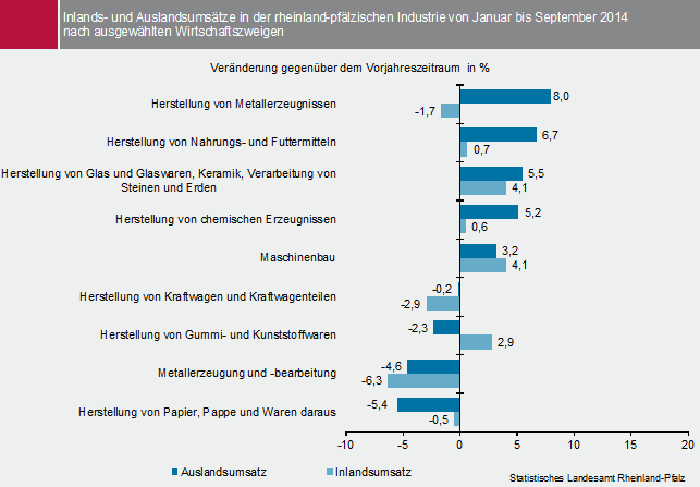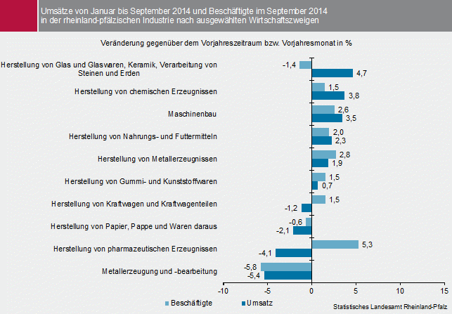 Sechs der zehn umsatzstärksten Industriebranchen erzielten von Januar bis September 2014 im Vergleich zum Vorjahreszeitraum Umsatzzuwächse. Die Hersteller von Glas und Glaswaren, Keramik, Verarbeitung von Steinen und Erden sowie die chemische Industrie verzeichneten weiterhin die höchsten Erlöszuwächse (plus 4,7 bzw. 3,8 Prozent). In diesen beiden Wirtschaftszweigen wurde die gute Entwicklung vor allem vom expandierenden Auslandsgeschäft (plus 5,5 bzw. 5,2 Prozent) flankiert, während bei den Herstellern von Glas und Glaswaren, Keramik, Verarbeitung von Steinen und Erden auch das Inlandsgeschäft (plus 4,1 Prozent) Impulse gab. Die günstige Gesamtentwicklung wurde zudem von den überdurchschnittlich hohen Umsatzzuwächsen im Maschinenbau getragen, der bessere In- und Auslandsgeschäfte tätigte. Die Metallerzeugung und -bearbeitung sowie die Hersteller von Datenverarbeitungsgeräten, elektronischen und optischen Erzeugnissen verzeichneten deutlich rückläufige Umsätze.